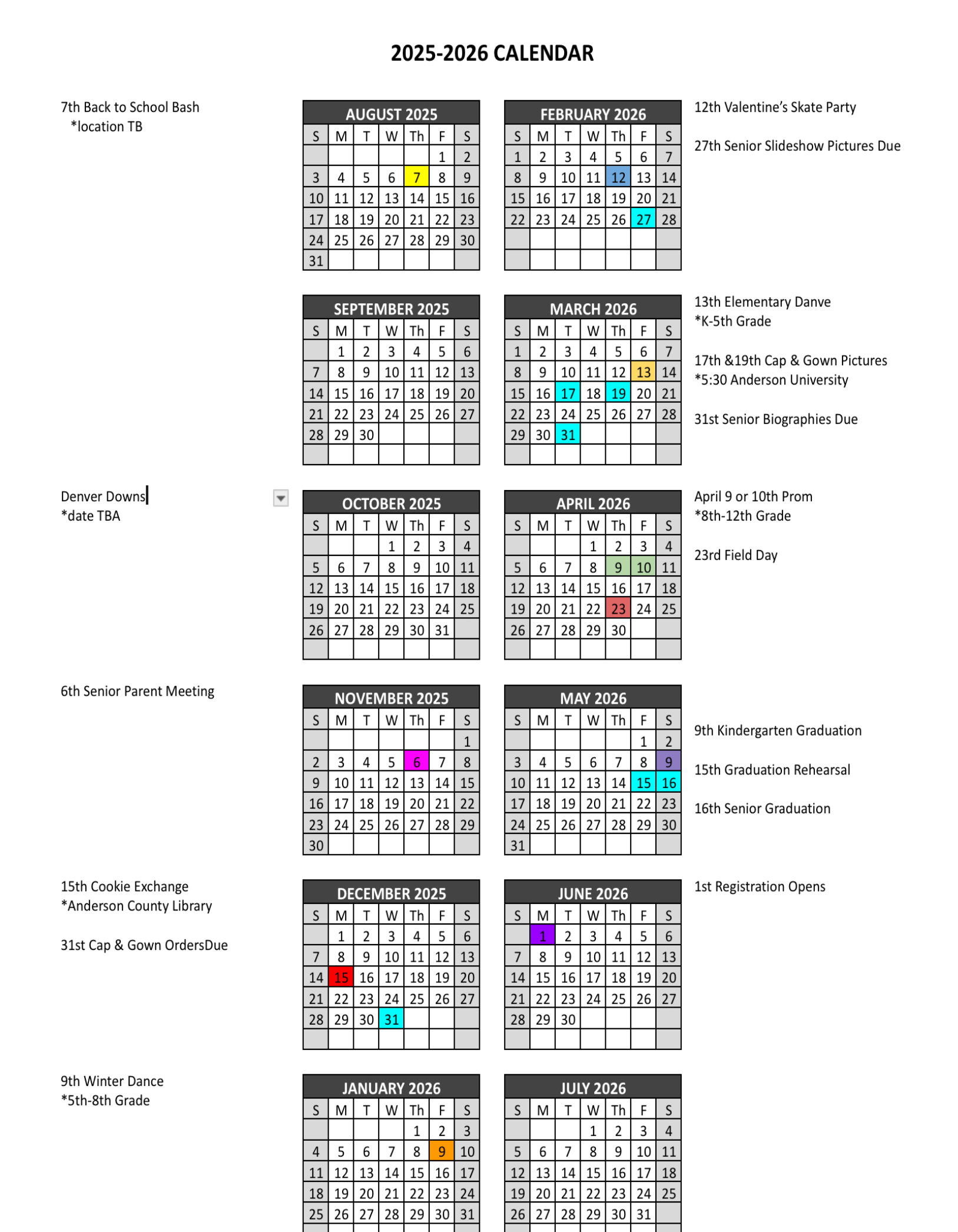 Please Note: Events added throughout the year will not appear on the calendar below. Check the Activities and Field Trip page for more information and other
